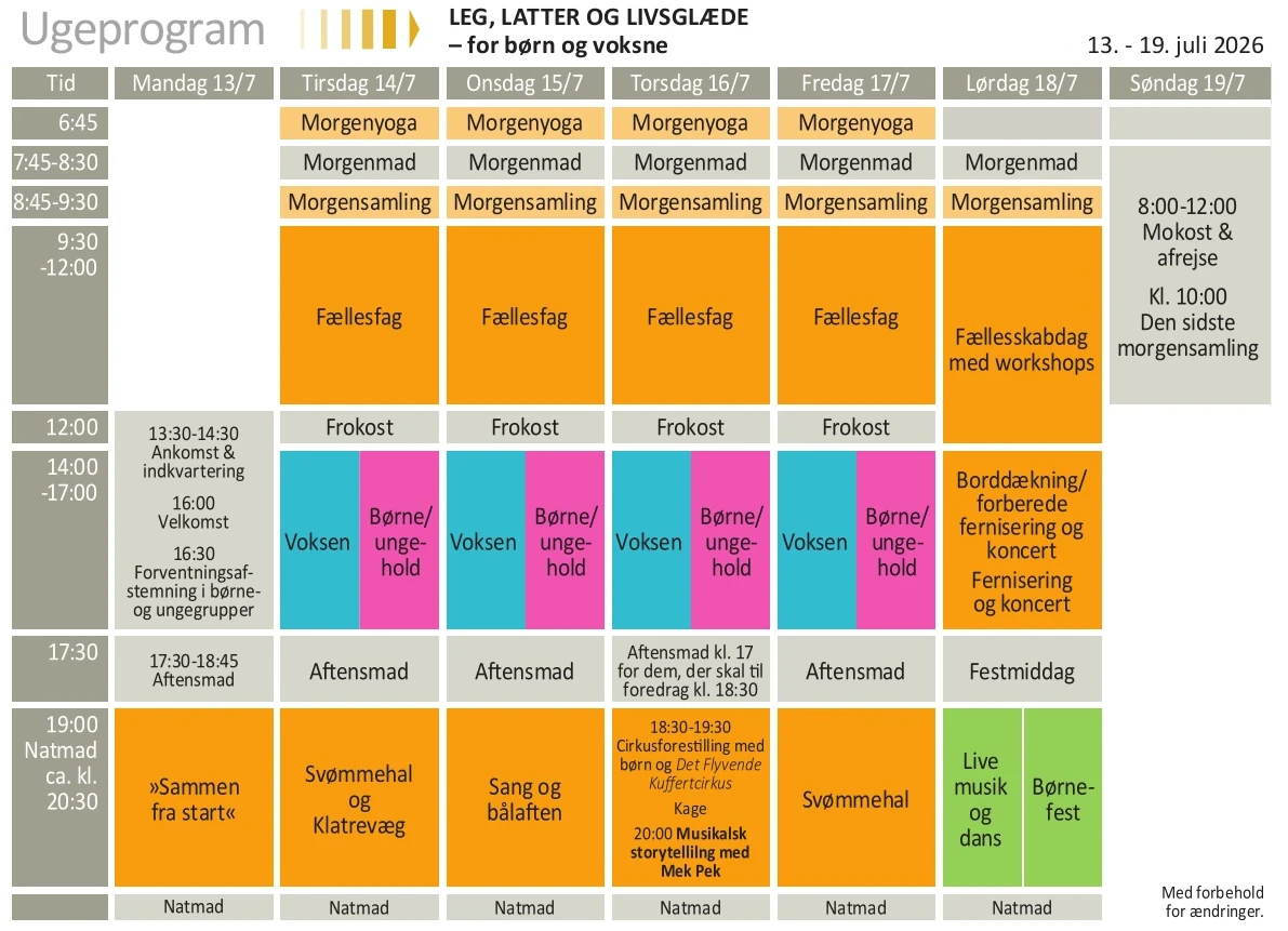 Aftenarrangementer: Velkomst, Musikalsk storytelling med Mek Pek og Cirkusforestilling med børn og ”Det flyvende kuffertcirkus”, åben svømmehal, klatrevæg, og bålaften.