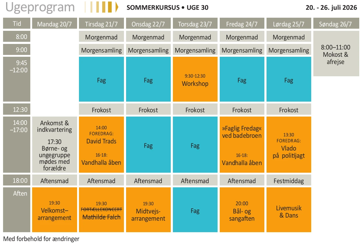 Alle dage indledes med morgensamling, hvor vi synger fællessang og lytter til et oplæg fra en underviser. Ugen ud vil der være aftenarrangementer i forskellig form og til forskellig smag. Der er både undervisning, foredrag, underholdning og socialt samvær.